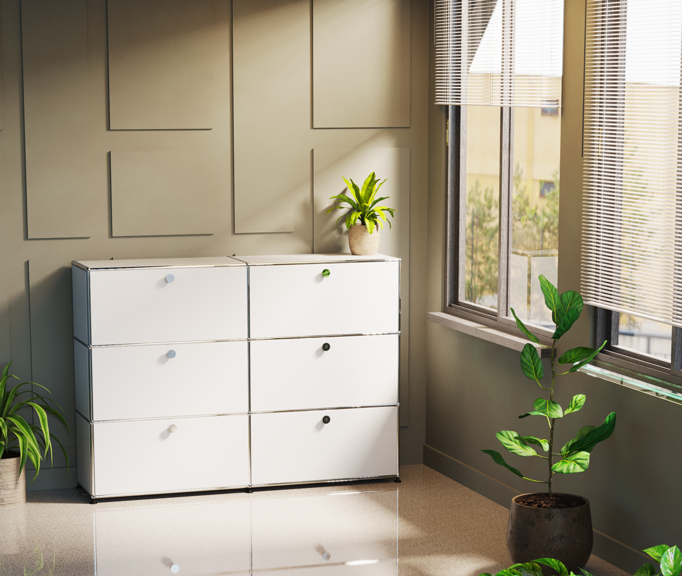 Die moderne, zeitlose Ästhetik der Quadria Modulmöbel fügt sich nahtlos in eine Vielzahl von Einrichtungsstilen ein, ob minimalistisch, klassisch oder modern. Dank der hochwertigen Verarbeitung und klaren Linien heben unsere Möbel deine Räume auf ein neues Niveau. Als eigenständige Marke orientiert sich Quadria an den ikonischen USM Haller Möbeln, bringt jedoch durch eigene Designvarianten frische Akzente ein.